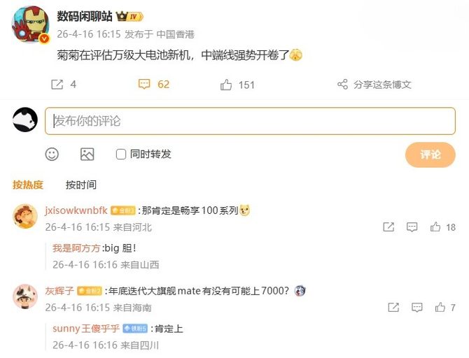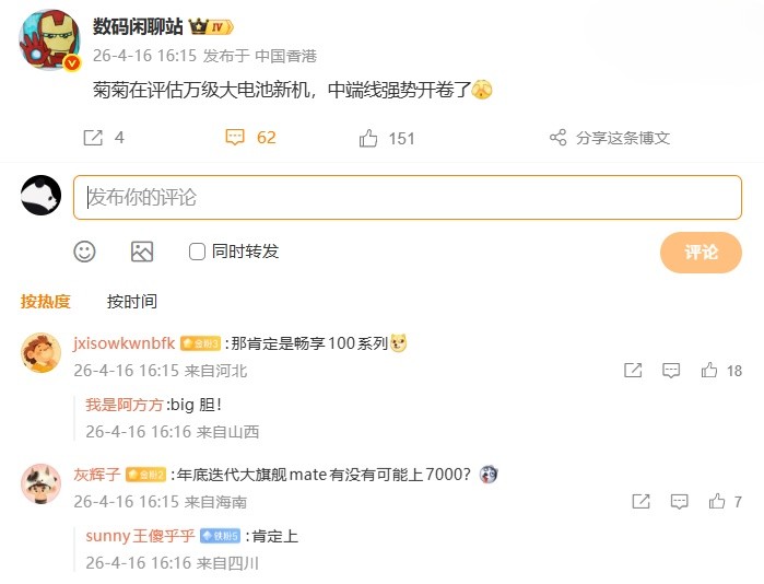 4月16日消息,博主数码闲聊站透露华为正在评估万级大电池新手机,感叹华为中端线强势开卷。今年 2 月华为终端 BG CTO 李小龙曾发布视频科普 nova 15 系列手机电池容量释放率优化技术,核心手段为下调关机电压充分释放硅负极电池容量。