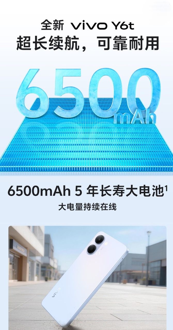 4月20日消息,vivo Y6t 手机开启预售,主打 6500mAh 大电池设计,搭载骁龙 4 Gen 2 移动平台,售价 1299 元起,6+128GB 版本定价 1299 元。