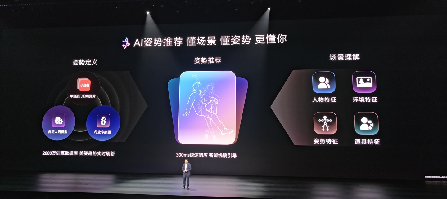 AI 姿势推荐功能基于 2000 万训练数据库,结合平台热门拍照姿势和自研人因模型,可实现 300ms 快速响应并提供智能线稿引导。AI 辅助构图支持人物、环境和姿势等特征的场景理解。