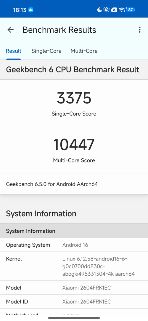 GeekBench 6的单核心跑分来到了3375,多核心跑分来到了10447。