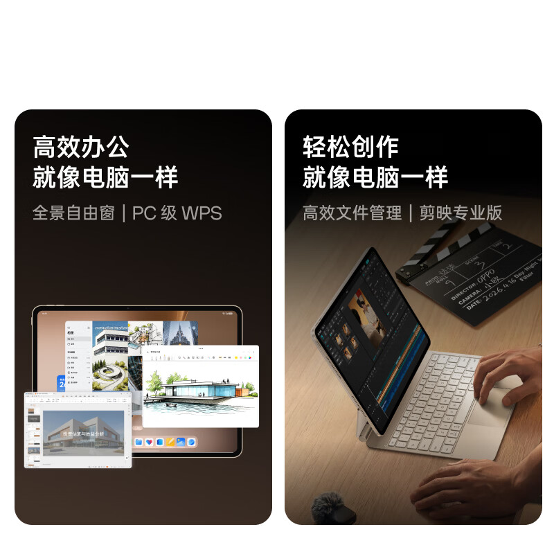 生产力方面支持剪映专业版,0.8 秒导入 10G 素材、10.5 分钟导出 30 分钟 4K 120FPS 视频。出厂预装 ColorOS 16,支持多窗口体验和 PC 级 WPS,可作为电脑副屏使用。