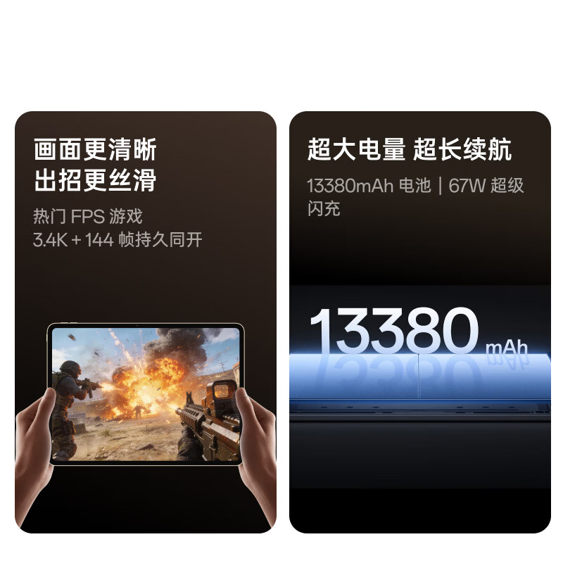 该平板内置 13380mAh 电池,是 OPPO 迄今为止电池容量最大的平板,支持连续刷 16 小时抖音或追剧 20 小时。屏幕支持杜比视界、HDR Vivid 和 ZREAL 帧享认证,配备 Hi-Fi 级八扬声器系统。存储提供 8GB+256GB 到 16GB+512GB 四种版本,国补后 256GB 版到手 3799 元。