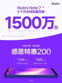 7月11日消息,Redmi红米手机官方发布微博称:7月11日—7月12日两天,Redmi Note7系列6GB版本到手价1199元起,感恩特惠降价200元。随后Redmi产品经理卢伟冰转发并评论该条微博:4800万像素,6GB版本1199元的特惠价,小金刚上市6个月,仍然性价比无敌,大家同意吧?