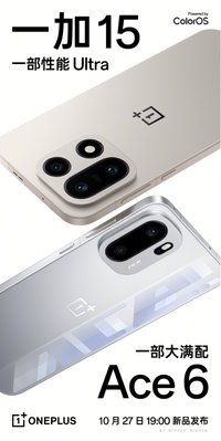 何思雅 · 2025-10-21 18:05 - 一加 15 与一加 Ace 6 官宣定档 10 月 27 日,双舰齐发打造最强性能体验